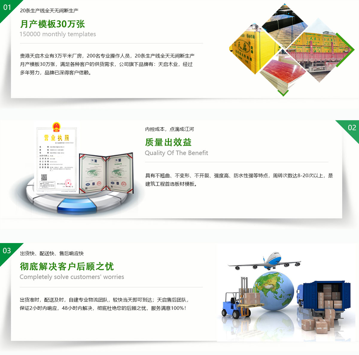 貴港市天啟木業(yè)位廣西貴港市覃塘區(qū),是中國建筑模行業(yè)規(guī)模十大的企業(yè)之一,有著優(yōu)越地理位置,臨廣東,貴州,湖南,云南、交通運(yùn)輸區(qū)位十分優(yōu)勢,F(xiàn)有職工近300人,占地50余畝,其中建筑面積近3萬平方米。日產(chǎn)量2萬張,年產(chǎn)量500萬余張;公司正在逐步壯大,旗下有4家分公司,總年產(chǎn)量近1500萬張!天啟木業(yè)引進(jìn)芬蘭制膠技術(shù),采用先進(jìn)生產(chǎn)工藝。公司生產(chǎn)的建筑膜板采用優(yōu)質(zhì)的防水膠制作,循環(huán)使用次數(shù)多,品質(zhì)在同行業(yè)內(nèi)認(rèn)可度極高。是一家集產(chǎn)品研發(fā),生產(chǎn),銷售,服務(wù)于一體的綜合型大型民營企業(yè)。產(chǎn)品覆蓋全國20多個省,市,自治區(qū)。